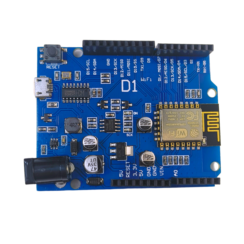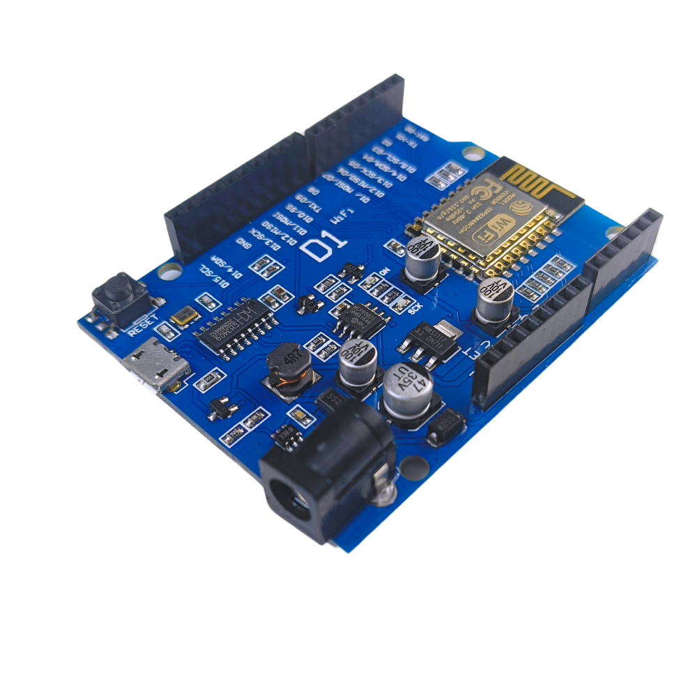 WeMos D1 – płytka z modułem WiFi ESP-12E, wykorzystującym układ ESP8266. Płyta jest zgodna mechanicznie z shieldami dla Arduino Uno, moduł ESP-12E odpowiedzialny jest za obsługę pinów GPIO, na płytce brak jest mikrokontrolera Atmega. Głównym ograniczeniem jeśli chodzi o wykorzystanie shieldów jest napięcie pracy, moduł pracuje z napięciem 3,3V.
